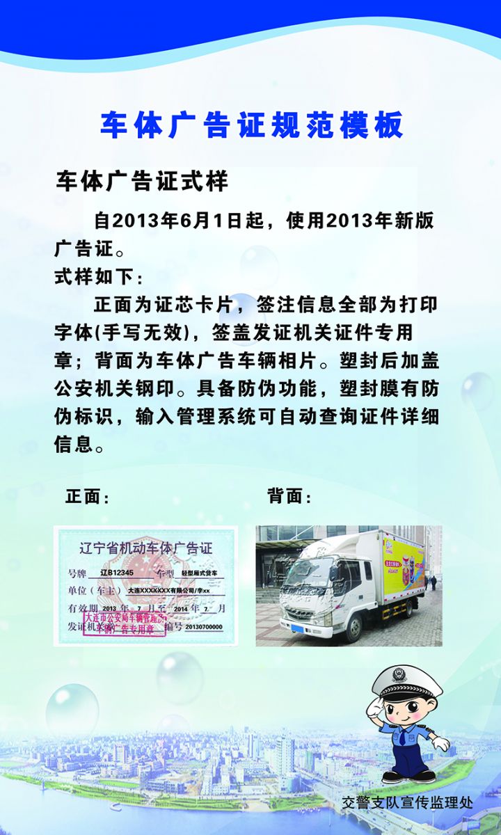 1、自2013年6月9日大連市車輛管理所啟用了新版的車體廣告證,2013年7月1日正式實(shí)施。